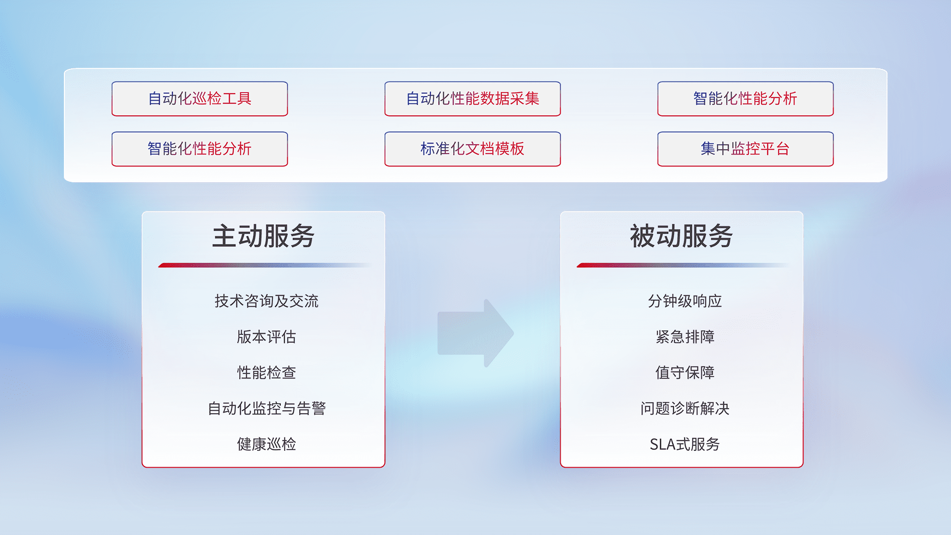 智能化工具和标准化文档,,,保障服务质量,,提供主动服务(包含技术咨询、、版本评估、、、性能检查、、、、自动化监控与告警、、、、健康巡检)和被动服务包含(分钟级响应、、紧急排障、、、、值守保障、、问题诊断解决、、SLA服务)。。。